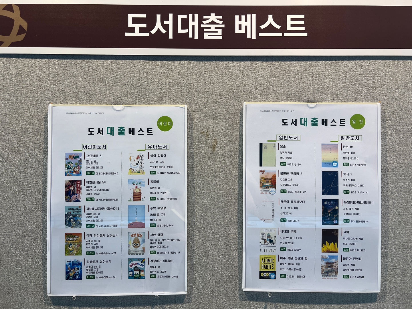 석수도서관은 게시판에 다양한 정보들을 알려주기도 하고 이렇게 대출베스트 도서를 정리해서 다른 사람들이 어떤 책을 많이 빌려갔는지 알 수 있어서 좋더라고요 : )