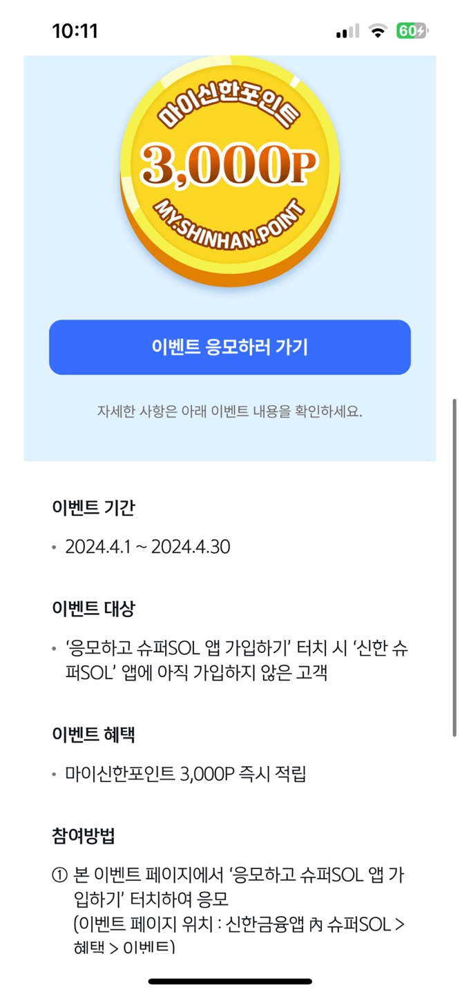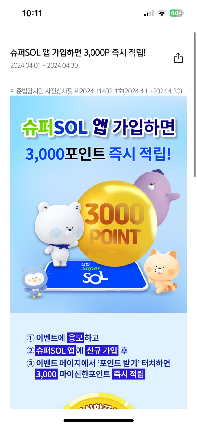 - 아래로 내리다 보면 '슈퍼 SOL앱 가입하면 3,000P 즉시 적립!'을 눌러주세요.