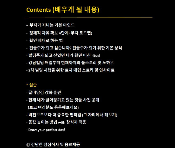 기본 마인드를 어떻게 가져야 하는지 그리고 지금 현재 나의 상황에서 내 몸값을 높이는 방법들 그리고 건물주가 되기 위해 알아야 하는 것들을 모두 알려주셨어요.