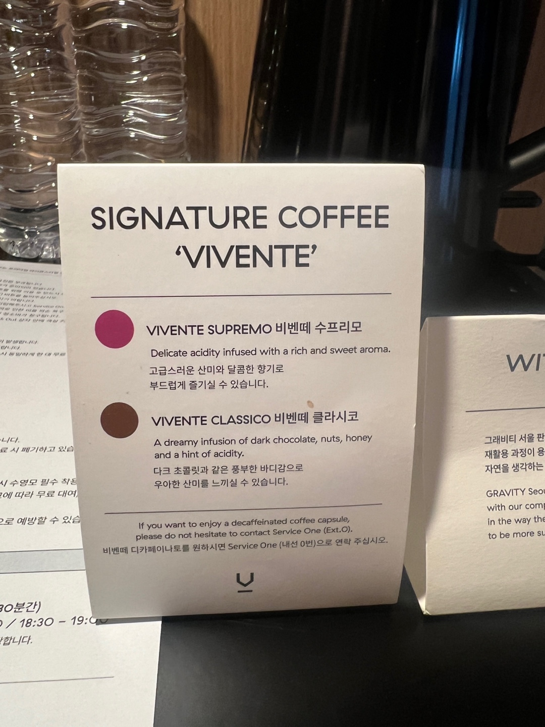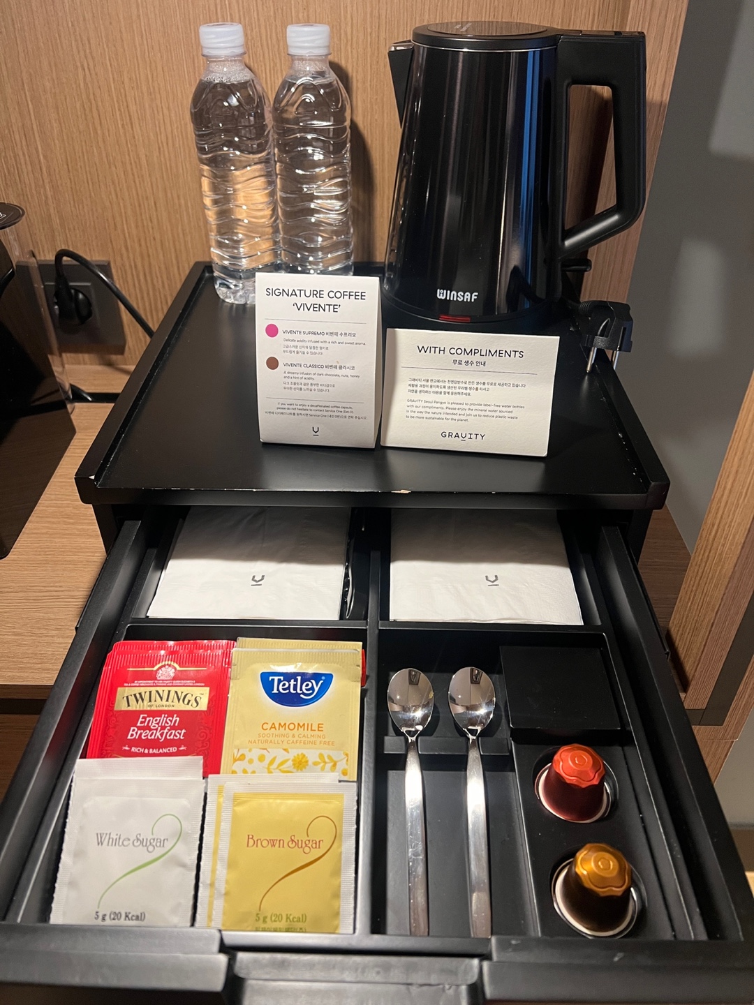 기본적으로 제공되는 물 2병, 캡슐커피와 차가 제공되고 있습니다.
